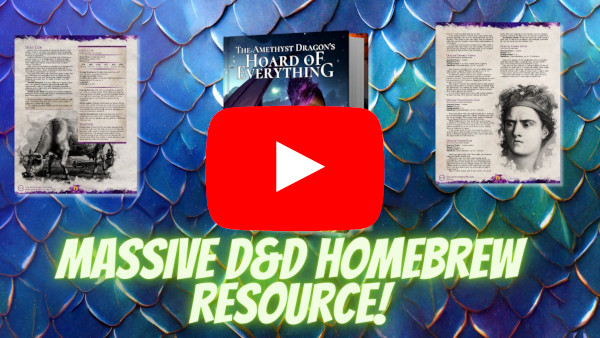The Amethyst Dragon's Hoard of Everything is my 592-page D&D 5e supplement that is filled with nearly 2,000 options and ideas for players and DMs.
